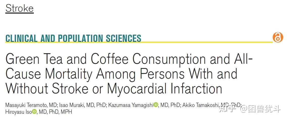 参考文献:Masayuki Teramoto, Isao Muraki, Kazumasa Yamagishi, Akiko Tamakoshi, Hiroyasu Iso. Green Tea and Coffee Consumption and All-Cause Mortality Among Persons With and Without Stroke or Myocardial Infarction.Stroke. 2021 Mar;52(3):957-965. doi: 10.1161/STROKEAHA.120.032273.Epub 2021 Feb 4.