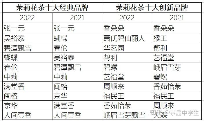 对比2021年中国茶叶流通发布的十大经典品牌和十大创新品牌,可以看出,十大经典品牌前十交椅排名虽有不同,但十大品牌没变。网上买茶,经典品牌依然可以选择张一元、吴裕泰,高端茉莉花茶依然可以选择碧潭飘雪。